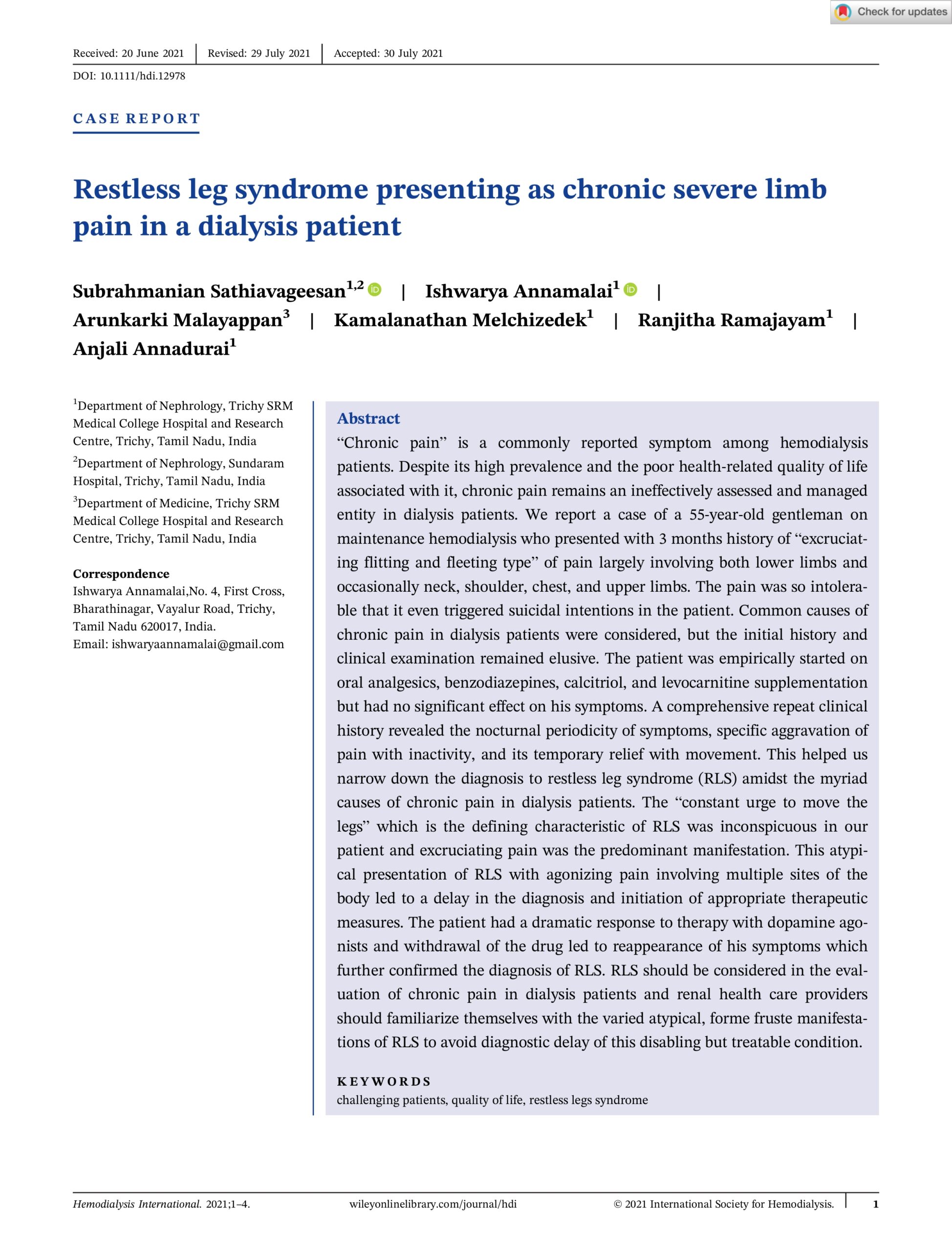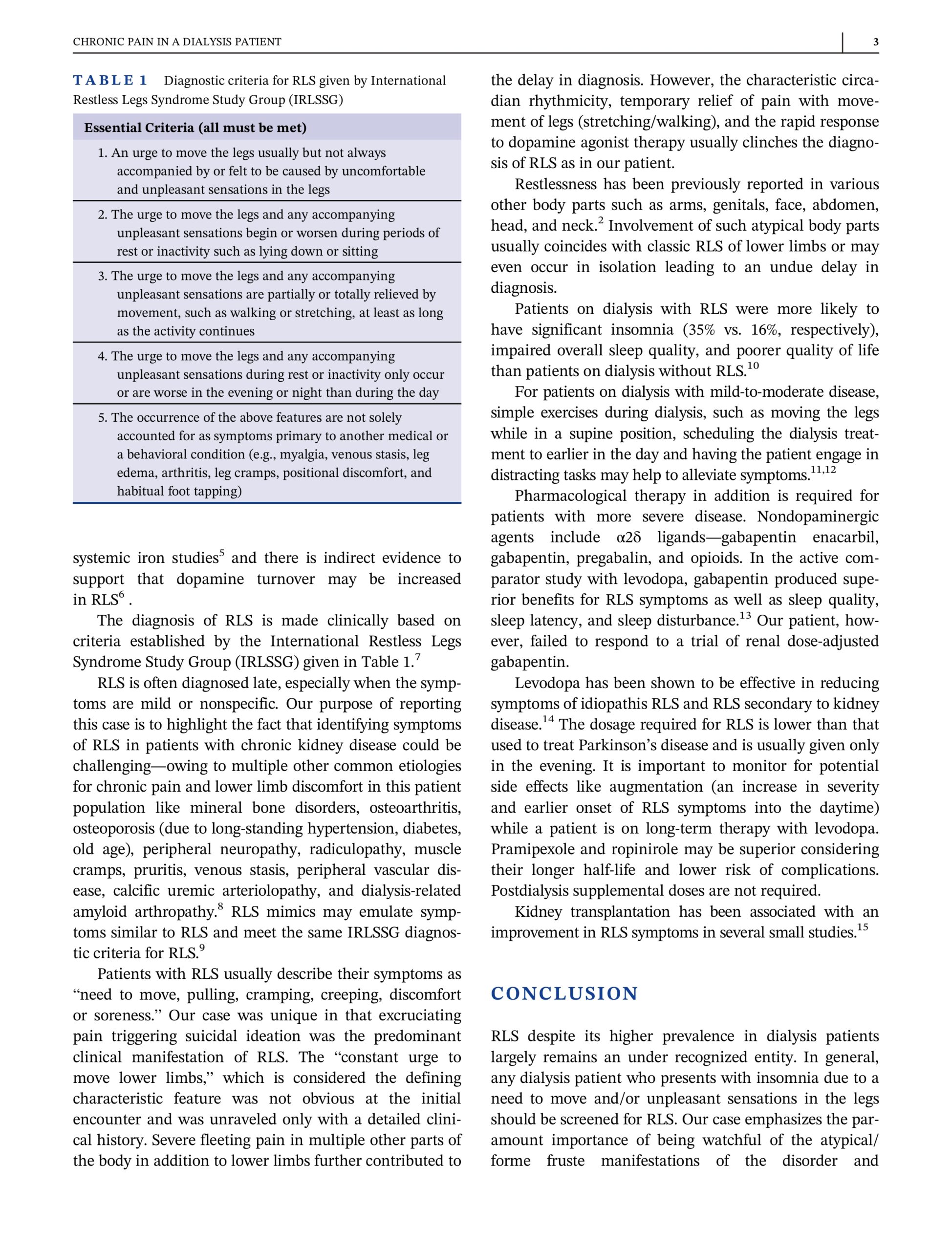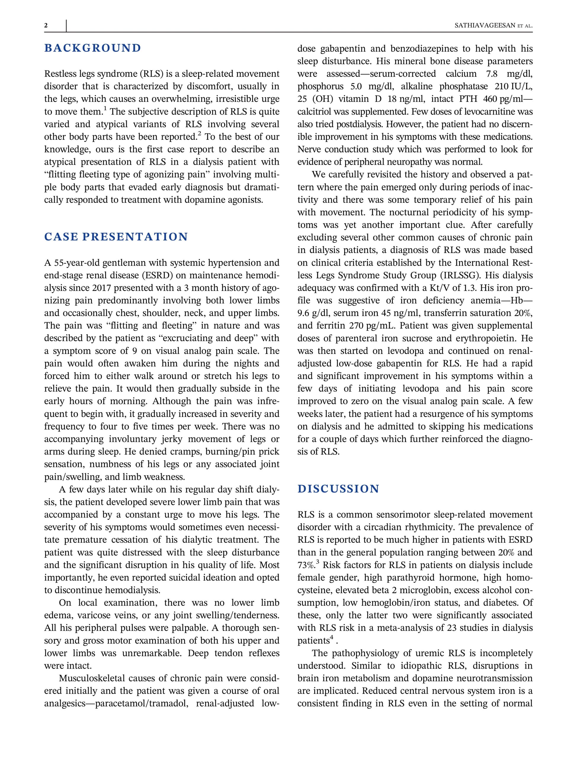 Restless Leg Syndrome Presenting As Chronic Severe Limb Pain In A Dialysis Patient